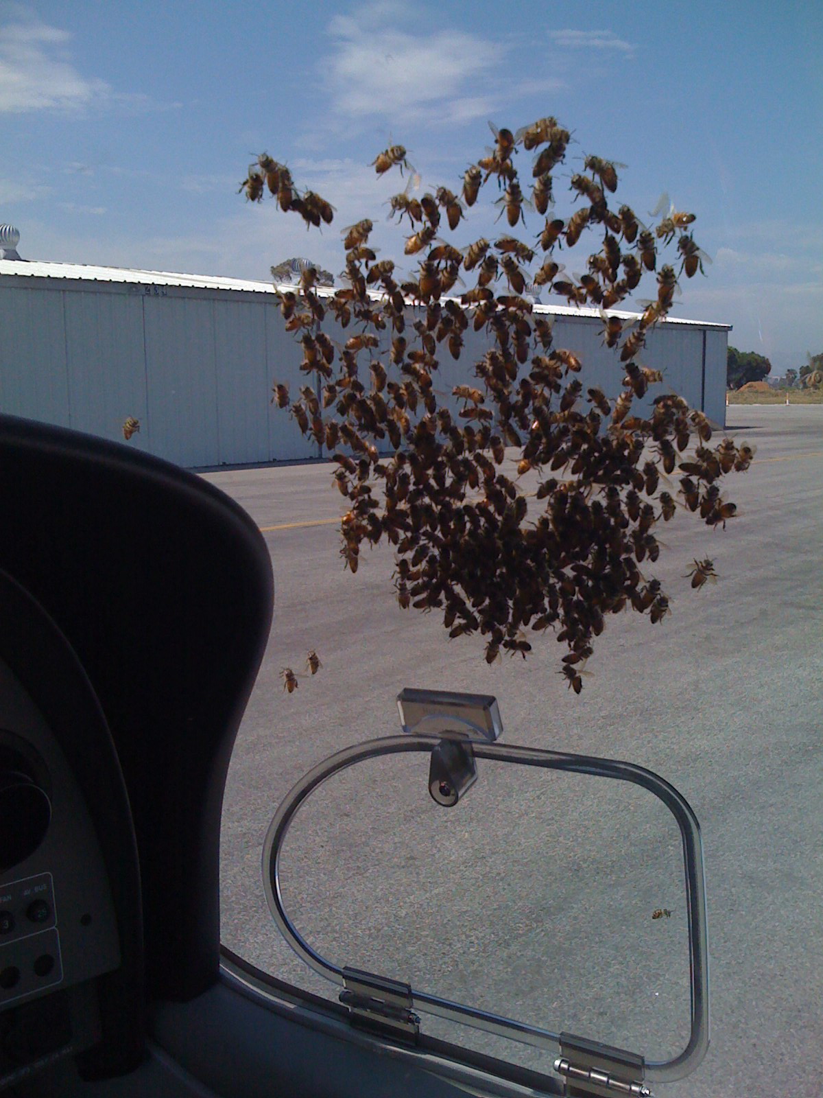 These are the bees that were left when I returned to the plane. Most blew off when I started it up. The remaining dozen stayed on until run-up (the engine is at 2,000 RPM for a few moments). There were two left who hopped off as I taxied to the transient parking area.
