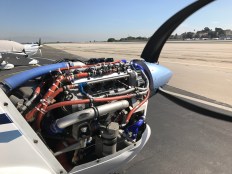 Dave came up and downloaded the engine data. We worried some about trying to get the left engine started since the propeller was in the feathered position. The started can’t turn the propeller fast enough when it against the wind like that, it just sort of whap-whap-whaps around and the engine doesn’t start. Fortunately, the moment he turned the key the propeller unfeathered, the engine turned and it roared to life. We keep it running until the engine coolant and oil are all warmed up. Technify (the engine company) says that we should run the engine at 100% for a minute and a half and then check the pressure in the propeller regulator valve (PRV). We taxi over to the high-power run-up area (right across the taxiway from my tie down) and Dave pushes the throttles forward while standing on the brakes. The engines roar for ninety seconds, not the slightest blip.